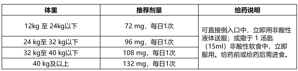 -口服颗粒剂型:可以直接倒入口中,立即用非酸性液体(如水、牛奶)送服;或将颗粒倒入1汤匙(约15ml)非酸性室温或低温软食中,立即服用。非酸性软食示例:布丁、土豆泥、奶油玉米、豌豆泥、香蕉泥、胡萝卜泥。不得使用酸性食物(如酸奶、苹果酱);若撒于软食中10分钟内服用,否则,需丢弃。