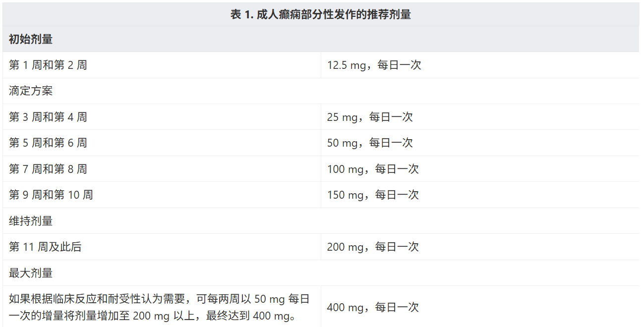 服用本品的患者报告了药物反应伴嗜酸粒细胞增多和全身性症状(DRESS),也称为多器官超敏反应。在本品滴定过快(每周一次或更快滴定)时发生了 DRESS,包括 1 例死亡。在以 12.5 mg 每日一次开始给予本品,此后每两周滴定一次时,在 1339 名部分性发作癫痫患者中进行的开放性安全研究未报告 DRESS 病例。虽然该结果并不确定更慢滴定可防范 DRESS 风险;但建议应以 12.5 mg 每日一次剂量开始给予本品,然后每两周滴定一次。DRESS 典型症状(但不完全是)表现为发烧、皮疹、淋巴结病和/或面部肿胀,可伴有其他器官系统受累,例如肝炎、肾炎、血液学异常、心肌炎或肌炎(有时与急性病毒感染相似)。嗜酸粒细胞增多经常发生。这种疾病的表现多变,还可能累及此处未提及的其他器官系统。重要的是要注意超敏反应的早期表现(例如发热或淋巴结病),即使皮疹不明显。如果出现此类体征或症状应立即对患者进行评估。如果不能确定这些体征或症状的其它病因,则应立即停用本品且不可再使用。